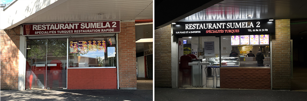 Exemple 2 : Les enseignes lumineuses d’un restaurant fast-food avaient perdu de leur panache : la lumière faiblarde, les faces PMMA ternies… Nos techniciens ont révisé et nettoyé ce qui a pu l’être (éclairage, éléments de structure en alu ayant résisté à l’usure du temps…) et nous avons rajouté les nouvelles faces diffusantes. A cette occasion, nous avons proposé à notre client de rajouter un éclairage par spots LED. Finalement, sur base de l’existant, l’établissement a changé de visage.