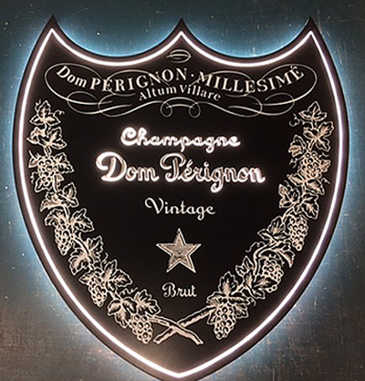 Le texte « Champagne Dom Perignon » a été usiné en relief et recouvert d’une contre-face en tôle inox fine.